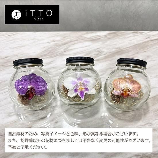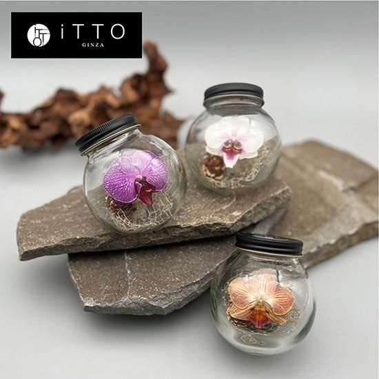 一輪一輪、丁寧に加工された胡蝶蘭は、まるで咲き誇る瞬間をそのまま切り取ったような美しさ。小さなボトルながら存在感があり、インテリアやデスク周りを華やかに彩ります。